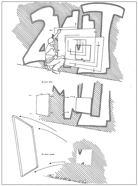 - dass die Tafeln nach Ablauf der 20 Jahre wieder abgenommen werden und die Graffiti-Ausschnitte mit den dann waltenden Umständen und Vorbeikommenden konfrontiert werden.