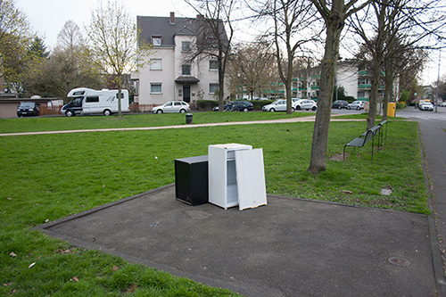 Eine kleine, asphaltierte Fläche in Köln-Nippes hat sich aufgrund vieler künstlerischer Bearbeitungen zu einem renommierten Ausstellungsort verwandelt. Christian Hasucha versuchte, diesen Ort durch eine spezielle Hinzufügung wieder zu profanisieren.