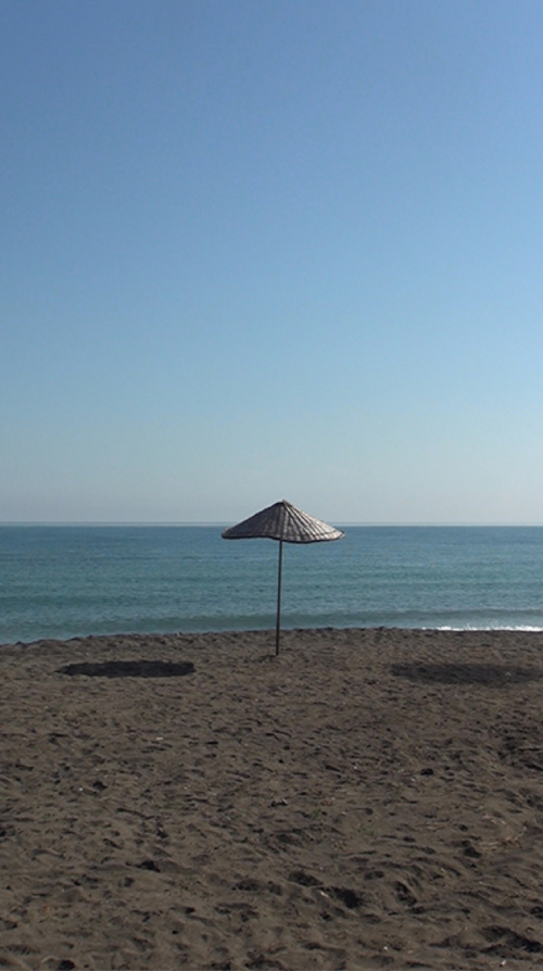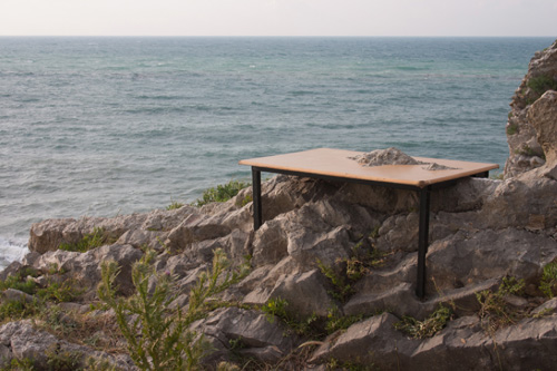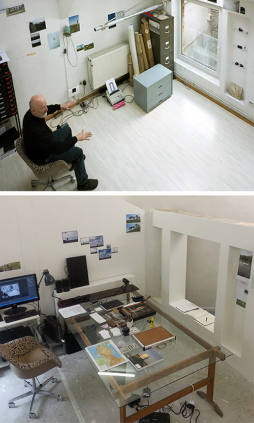 Johannes Imdahl Christian Hasucha: "Re-Akklimatisierungsraum" Galerie bauchhund Salonlabor, Berlin 31.10.2014 – 06.12.2014 Ein Zimmer geht auf Reisen – nicht das erste Mal geschieht dies im Laufe von Christian Hasuchas langjähriger Projektreihe der "Öffentlichen Interventionen". Vor einigen Jahren hatte der 1955 in Berlin geborene Künstler die Einzimmerwohnung seines Nachbarn Günter leergeräumt und für zwei Wochen auf einem Gerüst in der Innenstadt von Mülheim an der Ruhr nachgebaut, in gleicher Höhe und Himmelsrichtung, samt Mobiliar, dem Fenster mit dem Kissen, auf das sich der Nachbar gern lehnte, und Günter selbst dort wohnen lassen. Für fünf Wochen hat Hasucha nunmehr sich und sein Atelier-Büro von der Karl-Marx-Straße in die Galerie bauchhund Salonlabor versetzt. Sperrig, denn ebenso eingenordet zwängt sich der Nachbau im Maßstab 1:1 mit seinen Holzwänden um rund 35° verdreht in seinen Wirtsraum. Was man schon von außen durch die Glasfenster der Galerie sieht, konkretisiert sich beim Eintreten: hier liegen zwei Räume, die sich die Eingangstür und die Decke teilen, überkreuz und streiten um Gültigkeit. Mehr Hypothese als Faktum, evoziert das rekonstruierte Büro, dessen Fenster hier bloß offene Durchlässe sind, mit seiner angedeuteten Dachschräge, doch mit nahezu vollständiger Original-Einrichtung und dem am Schreibtisch arbeitenden Künstler Fragen zu den Gewissheiten räumlicher Identität - wie ablösbar ist ein Raum von seinem Ort, was geschieht hier eigentlich? Darüber hinaus tritt das Büro-Modell als "Re-Akklimatisierungsraum" in Erscheinung. CHRISTIAN HASUCHA, Re-Akklimatisierungsbüro, 2014, 1:1-Nachbau von Hasuchas Büro, Reisedokumentationen. Oben: Originalbüro, teilweise beräumt Unten: Nachbau im Galerieraum des bauchhund Salonlabor Fotos: copyright Christian Hasucha/VG Bild-Kunst, 2014 Knapp ein halbes Jahr lang war Hasucha mit seinem Werkstattwagen entlang der Schwarzmeerküste in Südosteuropa unterwegs gewesen, hat sich treiben lassen und gearbeitet, wo es ihm geeignet erschien. Er hat bei seiner Reise "am Horizont gedreht, Schatten nachgezeichnet oder gedoppelt, in Landschaften Markierungen und Anhaltspunkte implantiert und entnommen, hat etwas in den Wind geworfen, Fröschen Sergej Rachmaninov aus dem Autoradio vorgespielt oder einem Fluss seine Fließrichtung gezeigt" (Christoph Böhm, bauchhund Salonlabor). Der "Re-Akklimatisierungsraum", nicht ohne Ironie tatsächlich südöstlich des echten Atelierbüros gelegen, dient Hasucha als Ort des halböffentlichen Zwischenstopps, des Ordnens und Weiterverarbeitens seiner Reise-Interventionen. Als Entwurfszeichnung und als Foto ist zum Beispiel "Der Tisch und sein Berg" zu sehen, ein bei Abana (Türkei) in die Felsenküste gestellter Holztisch mit schwarzem Metallgestell, dahinter das Meer. Aus der mit Stichsäge bearbeiteten Tischplatte ragt als Miniatur-Berg ein Stück Felsen heraus. Dieser Tisch erscheint ganz anders als sein gläserner, physisch präsenter Verwandter im Büro-Modell. Ins Bildliche übertragen, löst er als gleichsam vertrautes, doch einsames und transformiertes Objekt eine besondere Empfindung aus, der nur allmählich Begriffe folgen. In weiches Licht getaucht, kontrastiert die Gesteinsoberfläche in der unteren Bildhälfte und ihre dynamisch über die Bilddiagonale verlaufende Kontur mit der sanften Meeresoberfläche und ihrem geraden Horizont. In diese archaische Szenerie fügt sich der Tisch, in seiner Gestalt nur leicht gewandelt, als archetypischer Kulturgegenstand, als Chiffre menschlichen Daseins. Wie ein Scharnier zwischen Mensch und Natur poetisiert und erklärt er die Landschaft, indem er die aus der Meeresfläche herausragende Landmasse skulptural aufgreift, sich in die Landschaft einbettet und sie gleichermaßen als Modell in sich einschließt. Als lose an die Wand gepinnter Papierausdruck vermittelt sich die Arbeit nicht als eine Hochglanz-Trophäe der Expedition; sie huldigt nicht einer Fotografie, die sich über ihren Gegenstand erhebt. Fernab jeden Verdachts digital-manipulativen Eingriffs gestattet das Bild eine betrachtende, assoziative Beschäftigung mit seinem seinem Ursprung, ohne technische Fragen zu berühren. ![]() CHRISTIAN HASUCHA, Der Tisch und sein Berg, 2014, Verschränkung von Tisch und Felsenküste bei Abana (Türkei). Foto: copyright Christian Hasucha/VG Bild-Kunst, 2014 Vergleichsweise raffiniert ist dagegen eine kontemplative Bewegtbild-Arbeit. Ein hochformatiger LCD-Monitor zeigt "Der Schatten und sein Bruder", ein ebenfalls menschenleeres Bild mit einem Sonnenschirm am Strand, der, streng mittig kadriert, zur linken Seite einen Schatten auf den Sandboden wirft. Rechts erscheint und verschwindet in langsamen Überblendungen ein zweiter Schatten, der die Symmetrie der Komposition zeitweise vervollständigt; ein recht kurzer Loop ohne Wandern der Sonne, geschickt gemacht, denn man sieht keine Überblendungen in den Wellen des in der Tiefe zu sehenden Meeres. Wie ein Arbeitsfoto in der Nähe des Bildschirms offenbart, handelt es sich bei dem rechten Schatten um Wasser, das auf den Boden gesprüht worden war. ![]() CHRISTIAN HASUCHA, Der Schatten und sein Bruder, 2014, Videoloop, Küste bei Ordu (Türkei), Sonnenschirm, Wasserfleck, in den Sand gesprüht und per Stopmotion dokumentiert. Video: copyright Christian Hasucha/VG Bild-Kunst, 2014 Eine weitere Videoarbeit ist eher dokumentarischer Natur und zeigt, wie Hasucha den kleinen Teil einer abgelegenen, von Wald und Feld umgebenen Schotterfläche bearbeitet. Mittels Pappschablone und weißem Sprühlack werden vier Winkel gleich einer Parkplatzmarkierung auf den Boden aufgetragen. Das kurzweilige, rhythmisch montierte Video zeigt den Arbeitsprozess und endet damit, wie Hasucha den Werkstattwagen, seinen für Arbeit und Reiseleben umgebauten Transporter, mit etwas Rangieren sorgsam in das durch die Klammern angedeutete Rechteck setzt - wie als erfüllender Abschluss eines notwendigen Vo